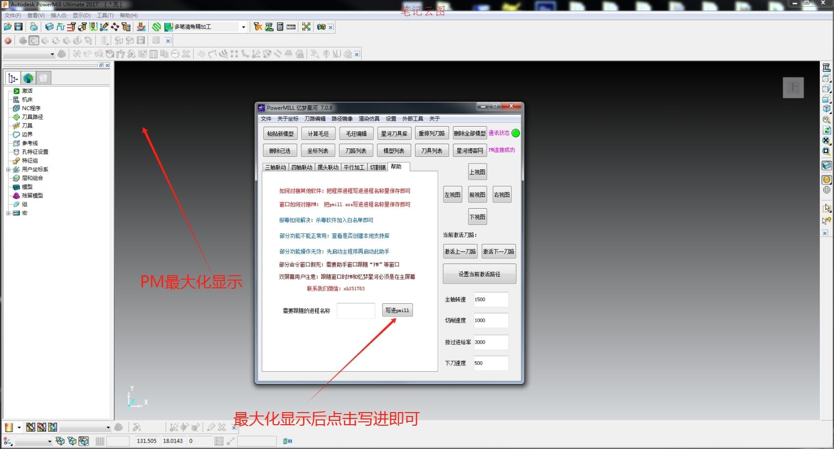 点击忆梦星河软件里的帮助,点击写进pmill按钮即可镶嵌跟随PM不会造成假死状态